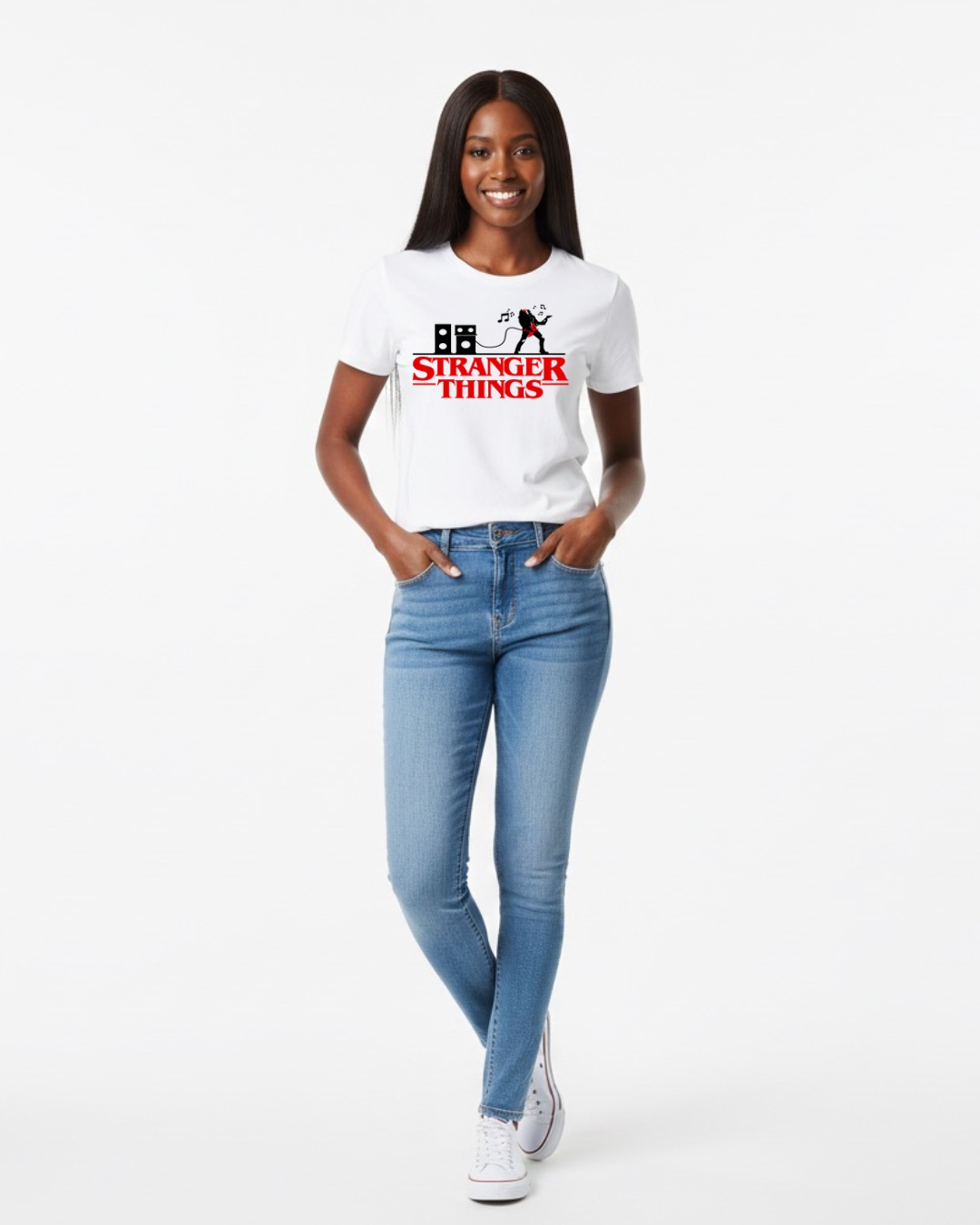 Não é apenas um logo, é um portal. Esta camiseta preta de algodão premium traz a tipografia vermelha e misteriosa de Stranger Things em destaque, um símbolo global de aventura, mistério e nostalgia dos anos 80.