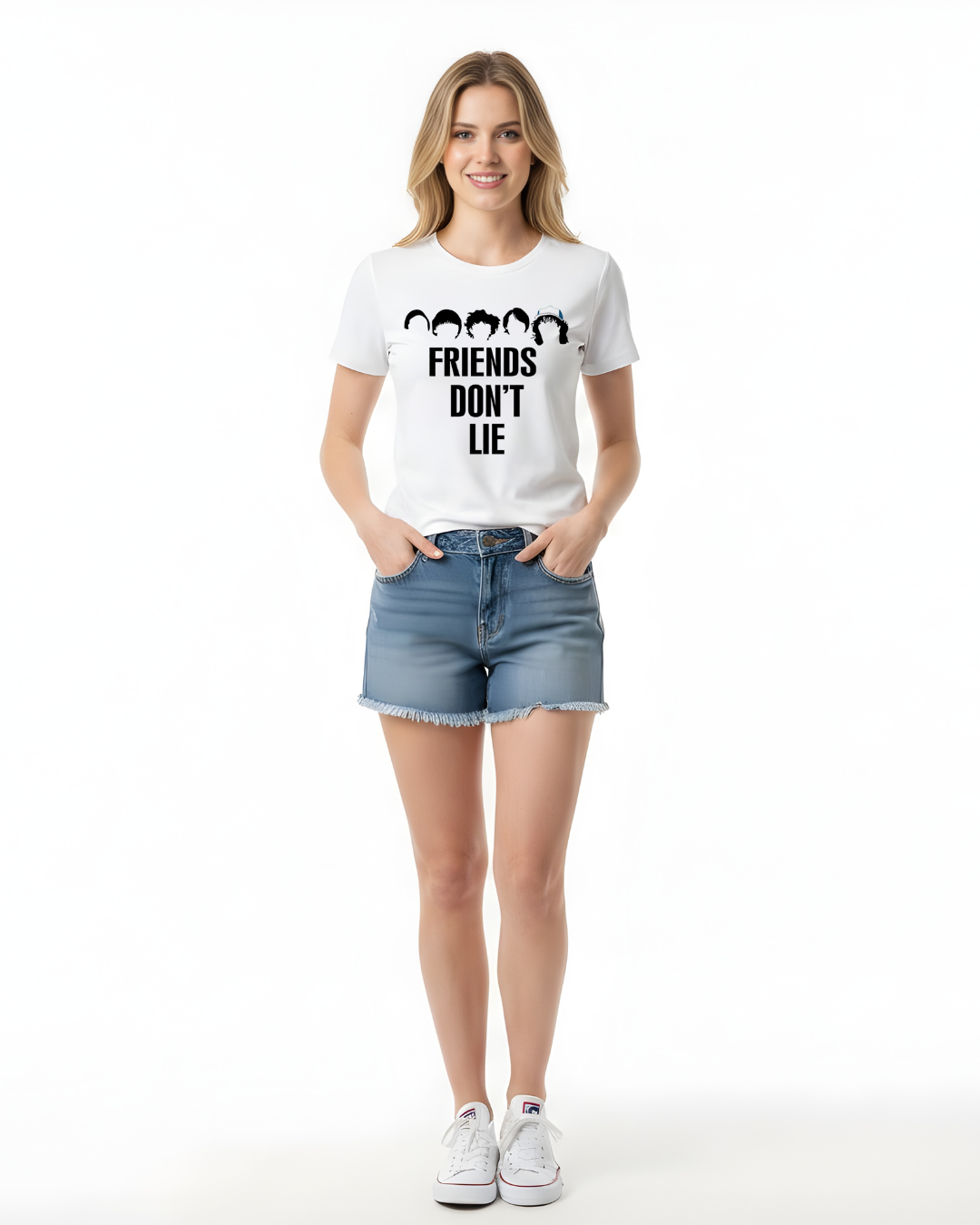A estampa traz a frase icônica de Eleven, "FRIENDS DON'T LIE", logo abaixo das silhuetas reconhecíveis de Mike, Dustin, Lucas, Will e Eleven. É a peça perfeita para quem valoriza a lealdade e o espírito de equipe do Clube AV.